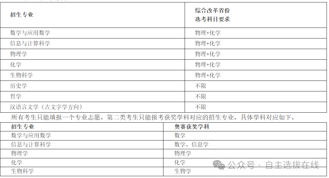 符合当年高考报名条件,综合素质优秀或基础学科拔尖,并有志于将来从事相关领域科学技术工作的高中毕业生均可申请报名。申请报名考生分为以下两类: