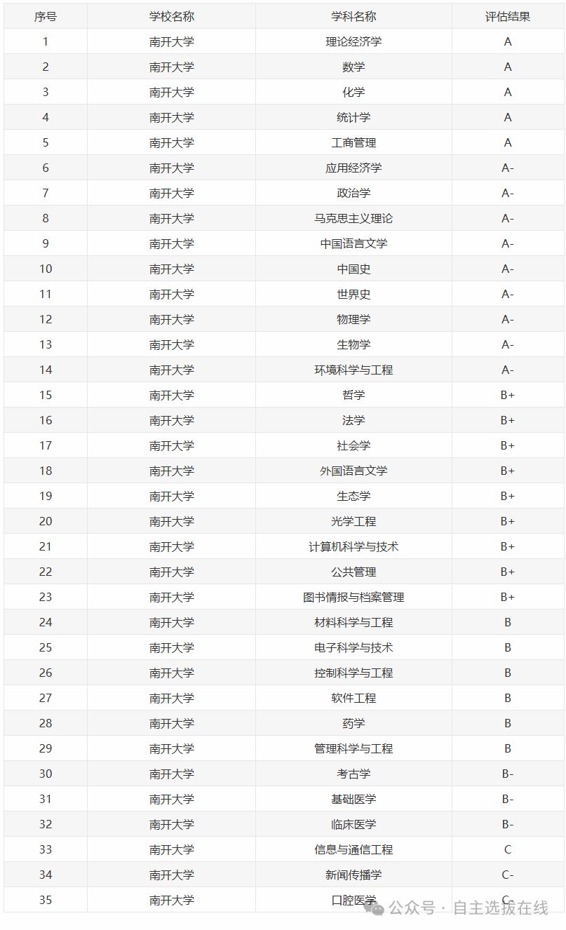 在第四轮学科评估中,南开有5个A专业,9个A-专业。以下是具体的学科评估结果。