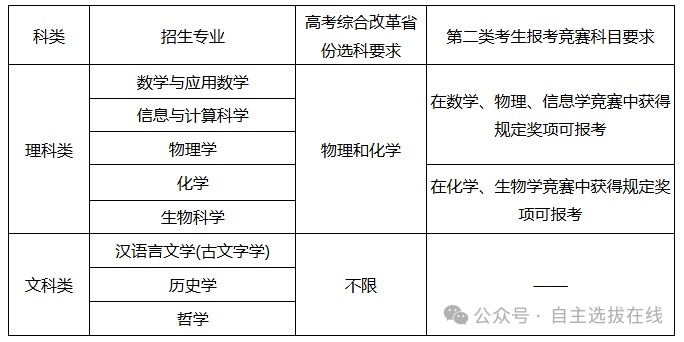 各省(区、市)符合普通高等学校招生全国统一考试报名条件,具有强烈的专业兴趣,综合素质优秀,基础学科拔尖,并有志于将来从事相关领域科学技术工作的学生。申请报名考生分为以下两类: