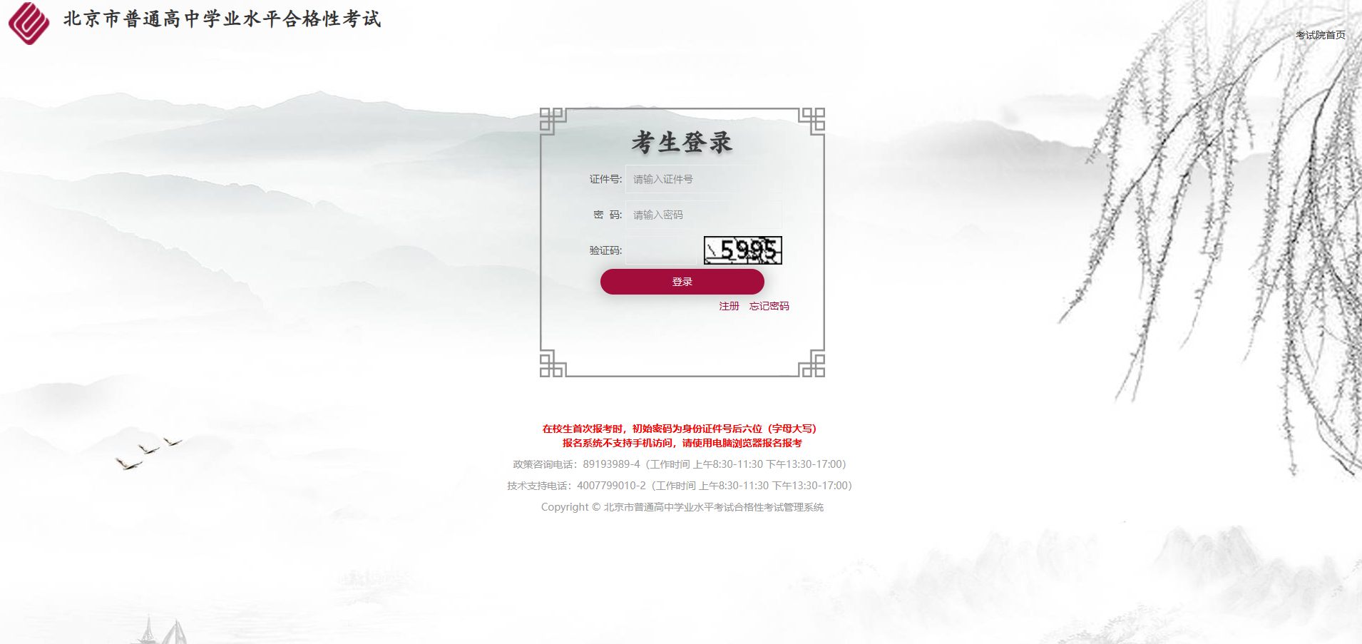 考生填写身份证件号及密码进行登录。在校生初始密码为身份证件号后六位,字母大写。