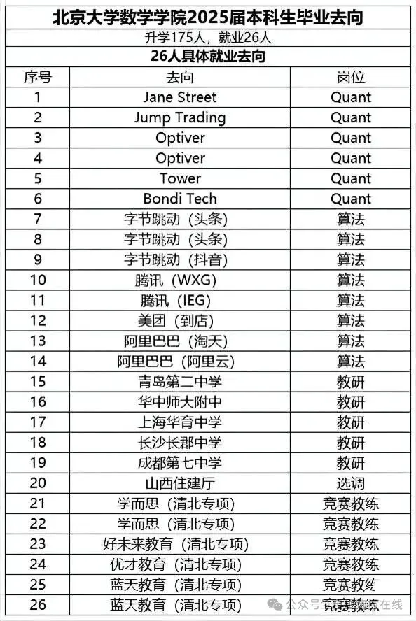 ⚡北大数学学院2025届本科毕业生共计201人,其中就业深造175人,就业26人,不少人就业去向大厂,部分毕业生奔向教育行业担任教师或是竞赛教练,只有1人考取了山西住建厅的选调生。