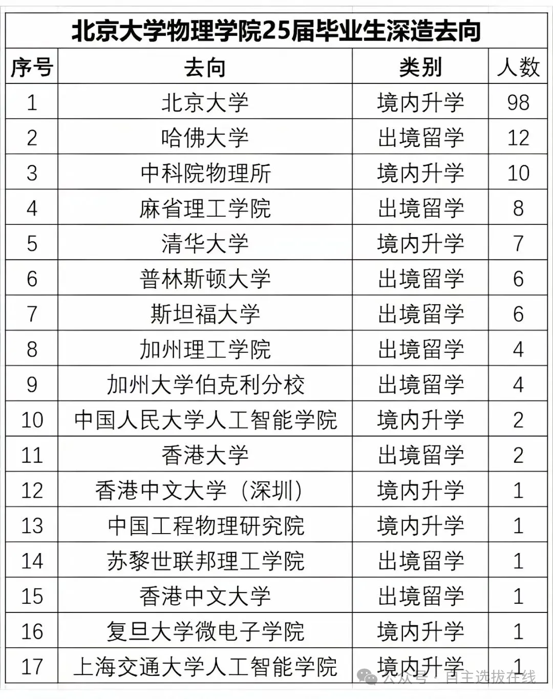 北大目前并未公布2025届毕业生就业情况,但自主选拔在线整理了数学学院与物理学院2025届本科毕业生深造去向网传版本,供大家参考。