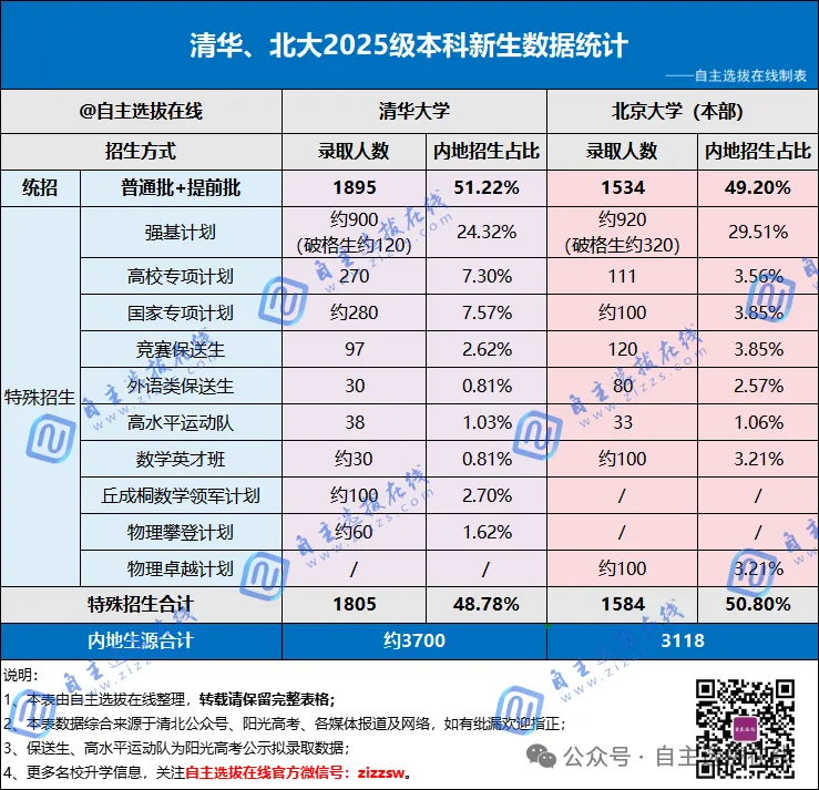 清华、北大开设了强基计划、数学少年班、物理少年班、高校专项计划、国家专项计划、竞赛保送生、外语保送生、高水平运动队等特殊招生项目。以下是2025年清华、北大各大本科招生项目新生录取数据统计表,仅供参考: