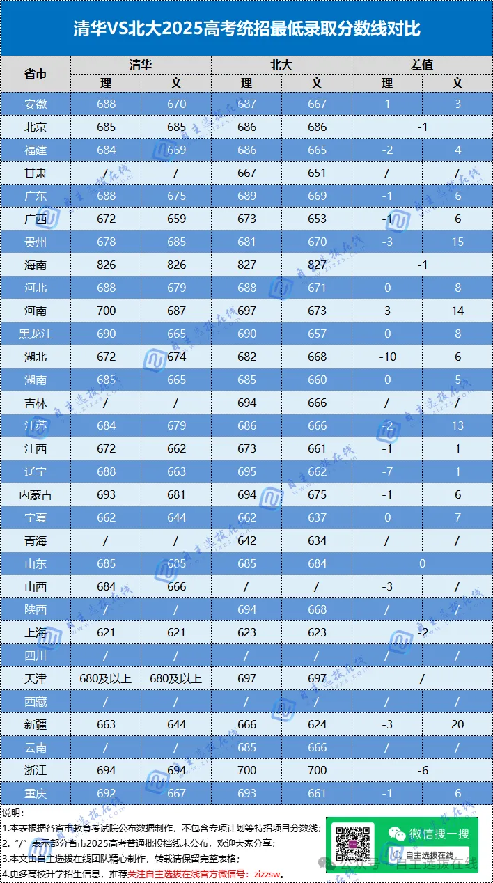 以下为清华vs北大2025高考统招最低录取分数线对比,清北两校2025年各省分数线普遍处于高位,多数省份理科分数线集中在670分以上,文科在650分以上。