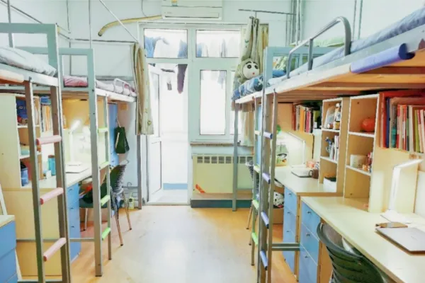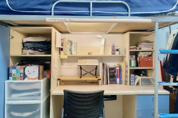 清华大学的宿舍都是上床下桌,每名学生都有自己的独立衣柜,独立书架,而且私密性很强,彼此之间干扰很少。