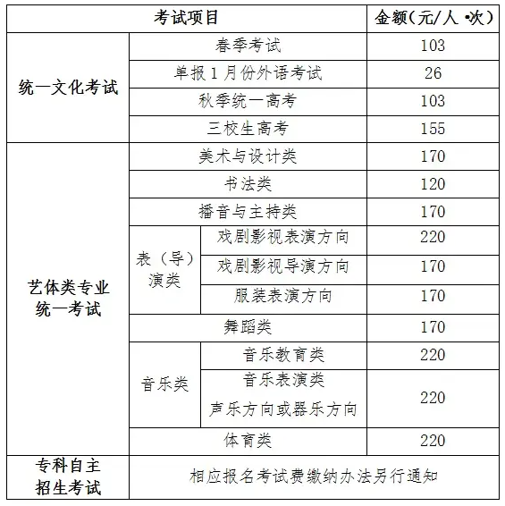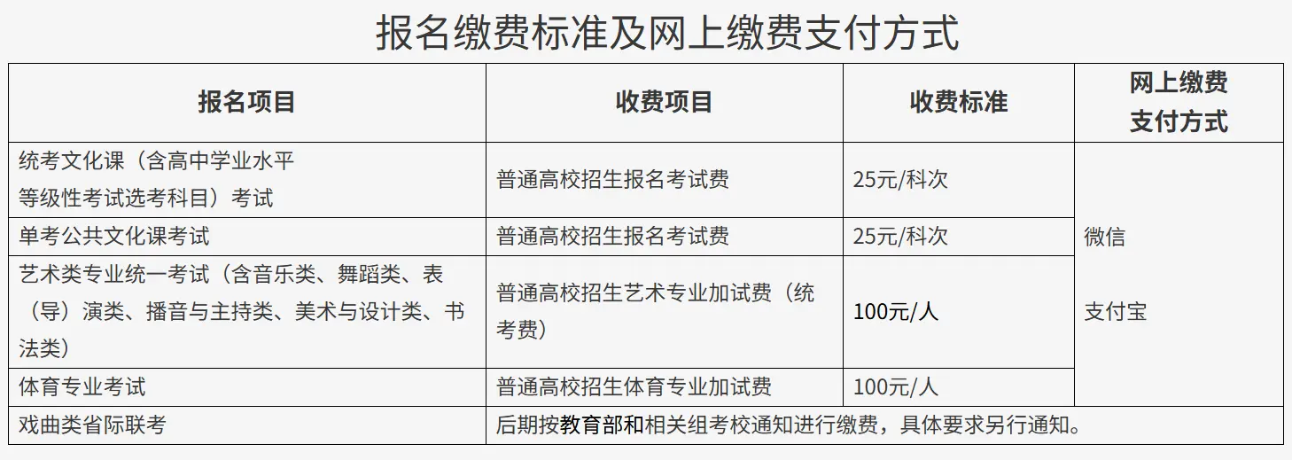(5)戏曲类报名考试费由省级联考或校际联考组考单位收取,具体事宜另行通知。艺术其他类报名费:35元/人,考试费30元/人·科。