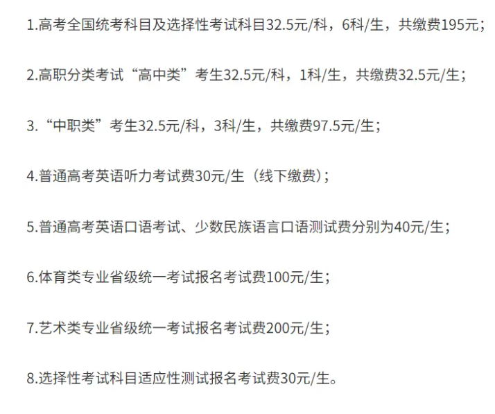 报名费每生40元(仅限普通高校招生考试收取);语文、数学、外语(不含听力和口语测试)等普通高校招生考试统考科目,以及综合科目(专业知识)考试费均为每生每科40元;外语听力测试和口语测试费均为每生35元,外语口语测试为自愿选择。