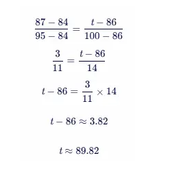 假设某考生在某再选科目(如化学)中的原始分为87分,该科目当年A等级原始分区间为95至84分,赋分区间为100至86分。根据等比例转换公式,该考生的等级赋分分数计算如下: