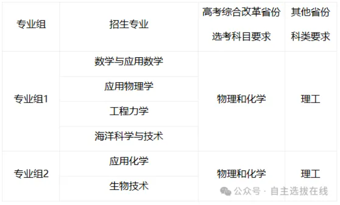 专业组1笔试科目为数理综合,专业组2笔试科目为化学。