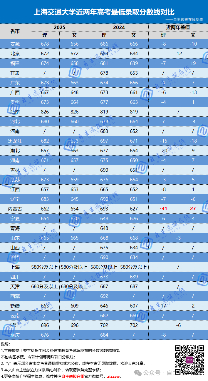 自主选拔在线团队汇总整理了上海交通大学近两年高考本科一批最低录取分数线对比,供考生家长参考。