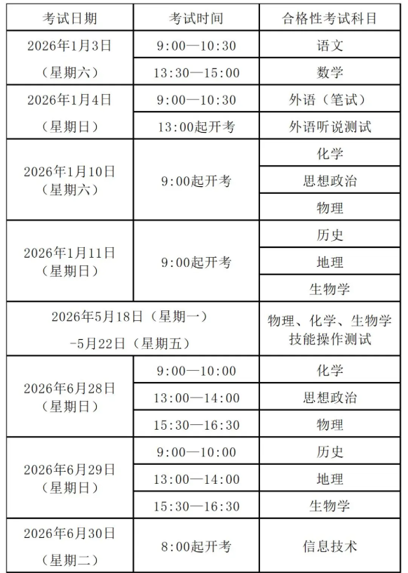 2026年6月的思想政治、历史、地理、物理、化学、生物学、信息技术7门合格性考试报考对象及要求为:高一在校生只能报考信息技术科目;高二、高三在校生及“其他考生”可选择报考思想政治、历史、地理、物理、化学、生物学、信息技术等科目。