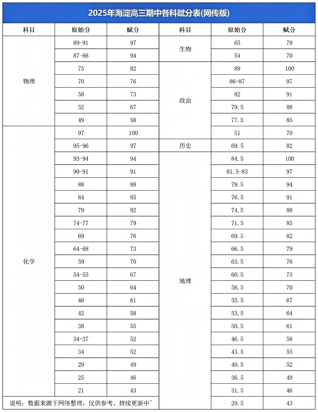 从网传的海淀高三期中各科赋分表来看,核心信息可简单总结为 3 点(需注意数据为网络整理,仅供参考):赋分核心逻辑:所有科目均遵循 “原始分越高,赋分越高” 的规律,通过赋分平衡不同科目难度差异,让跨科目分数具备可比性(符合北京新高考赋分规则)。各科赋分特点:高分段(原始分 85+)赋分优势显著:如生物原始分 89 赋 100、历史原始分 84.5 赋 100,顶尖原始分基本能锁定 90 + 甚至满分赋分;中低分段(原始分 30-70)赋分梯度清晰:如化学原始分 34-37 均赋 52,50 赋 64,64-68 赋 73,避免分数过度集中;部分科目赋分跨度较大:如物理、化学的原始分从 20 + 到 90+,对应赋分 43-97,覆盖区间广,能区分不同水平考生。关键提示:赋分表仅呈现 “原始分 - 赋分” 对应关系,未包含考生排名、各科平均分等核心参考数据,后续需关注官方公布的五分段表、划线情况,才能更精准判断成绩定位。