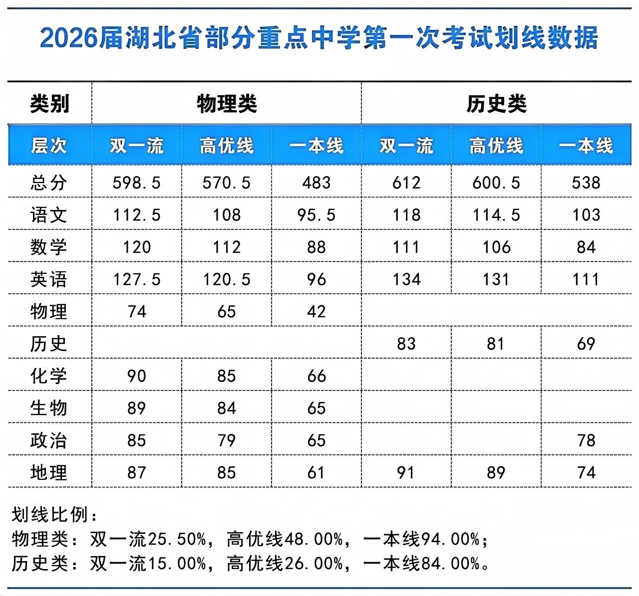本次划线在物理类和历史类分别设置了双一流、高优线和一本线三个层次。从总分来看,历史类双一流线(612分)高于物理类(598.5分),说明文科顶尖学生的竞争更为激烈。而高优线和一本线也呈现类似趋势,反映文科整体分数线偏高。