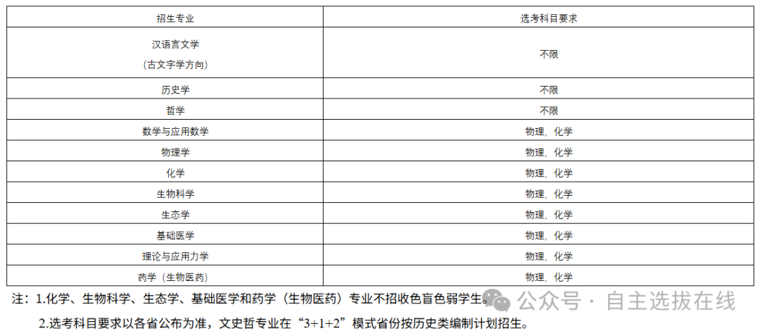 强基计划招生专业包括汉语言文学(古文字学方向)、历史学、哲学、数学与应用数学、物理学、化学、生物科学、生态学、基础医学、理论与应用力学、药学(生物医药)。各专业选考科目要求如下: