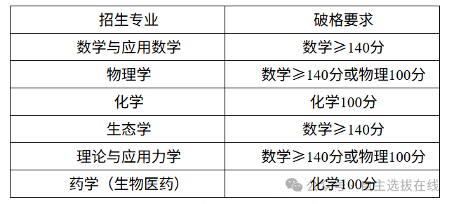 高考单科“小破格”入围模式即报考数学与应用数学、物理学、化学、生态学、理论与应用力学、药学(生物医药)专业且已确认报考的学生,如单科成绩符合以下要求,可破格入围校测。