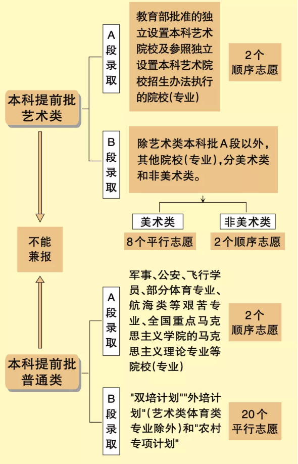 📌北京高招本科提前批分为艺术类和普通类,考生只能选报其中一类,不能兼报。普通类和艺术类均设置A、B两段,并分别按顺序依次录取。