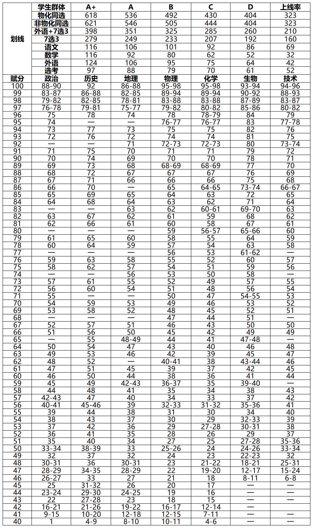 物化同选和非物化同选:这两个群体的A+分数较高(分别为618和621),且各等级分数相近,表明物化组合的学生整体成绩较好,或考试难度相对均衡。上线率均为323,说明上线分数门槛相同。
