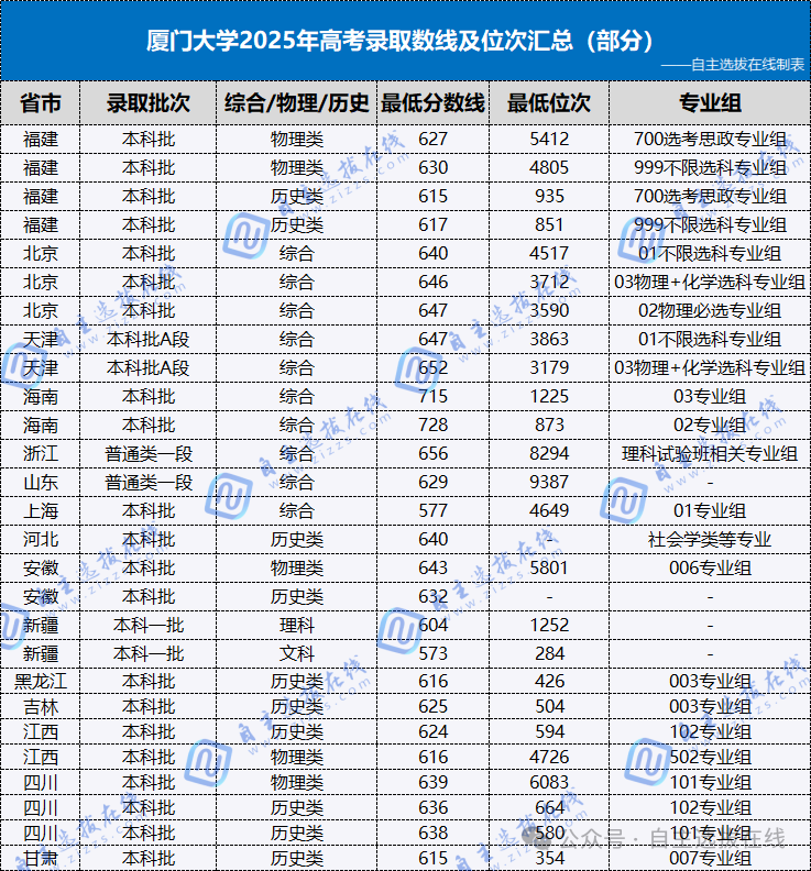 因厦门大学暂未公布2025年高考录取分数线,自主选拔在线为大家汇总整理了各省市教育考试院公布的厦大2025年各省市高考录取分数线及位次汇总,供各位考生家长参考。
