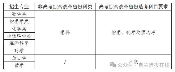 强基计划招生专业包括数学类、物理学类、化学类、生物科学类、海洋科学、药学、历史学、哲学。各专业选考科目要求如下: