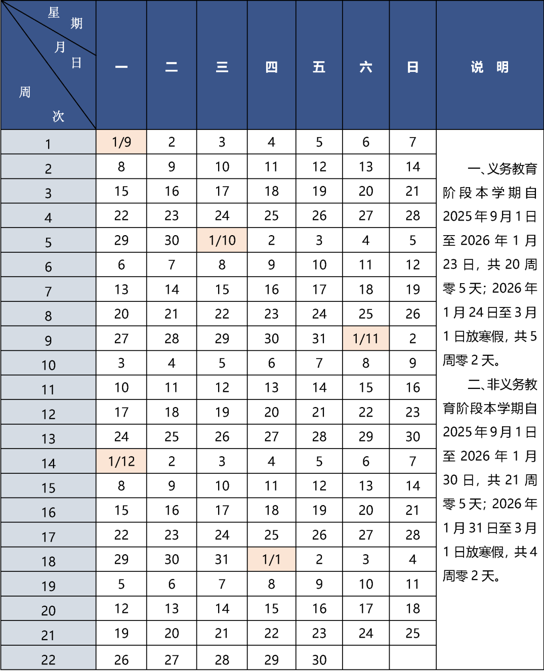 结束本学期工作:2026年1月23日(星期五),结束本学期工作,共20周零5天;