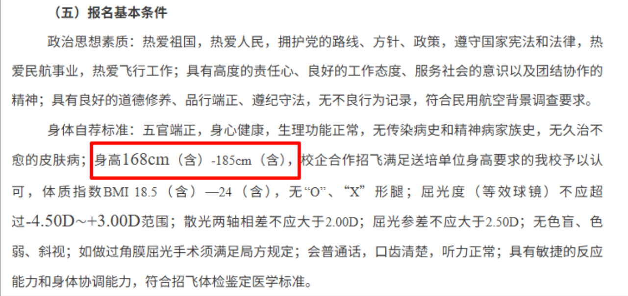 1.空军招飞:身高在165—185厘米之间(未满18周岁的,在164—185厘米之间);体重在52公斤以上(未满18周岁的,在50公斤以上),不低于标准体重的80%,不高于标准体重的130%(标准体重kg=身高cm-110)。