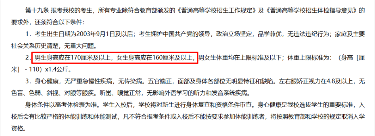 国际关系学院2025年本科招生章程,里面明确提到:男生身高应在170厘米及以上,女生身高应在160厘米及以上,男女生体重均在上限标准及以下;体重上限标准为:(身高[厘米]-110)x1.4公斤。
