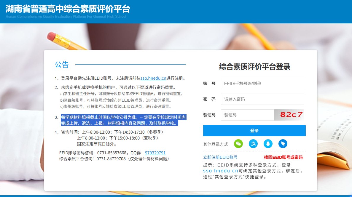 最近全国各个省份的综合素质评价填写陆续在线上开始,湖南综合素质评价填写平台提醒考生:每学期材料填报截止时间以学校安排为准,一定要在学校规定时间内完成上传、遴选、上报。 材料填报内容及问题,及时联系学校。