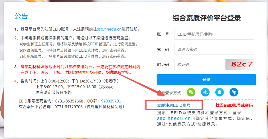 1.电脑进入平台界面:http://zhpj.hnedu.cn/login,点击【立即注册EEID账号】。如下图:
