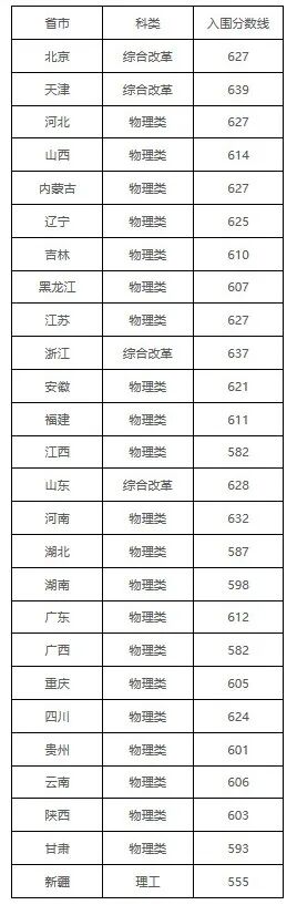 中国农业大学2025年强基计划各省第一类考生最低入围分数线分别为: