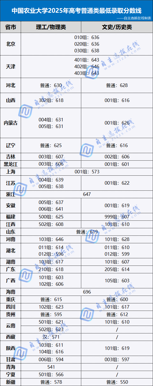 自主选拔在线团队根据中国农业大学官网公布的数据,为大家汇总整理了的中国农业大学2025年各省市高考普通类录取分数线,供各位考生家长参考。