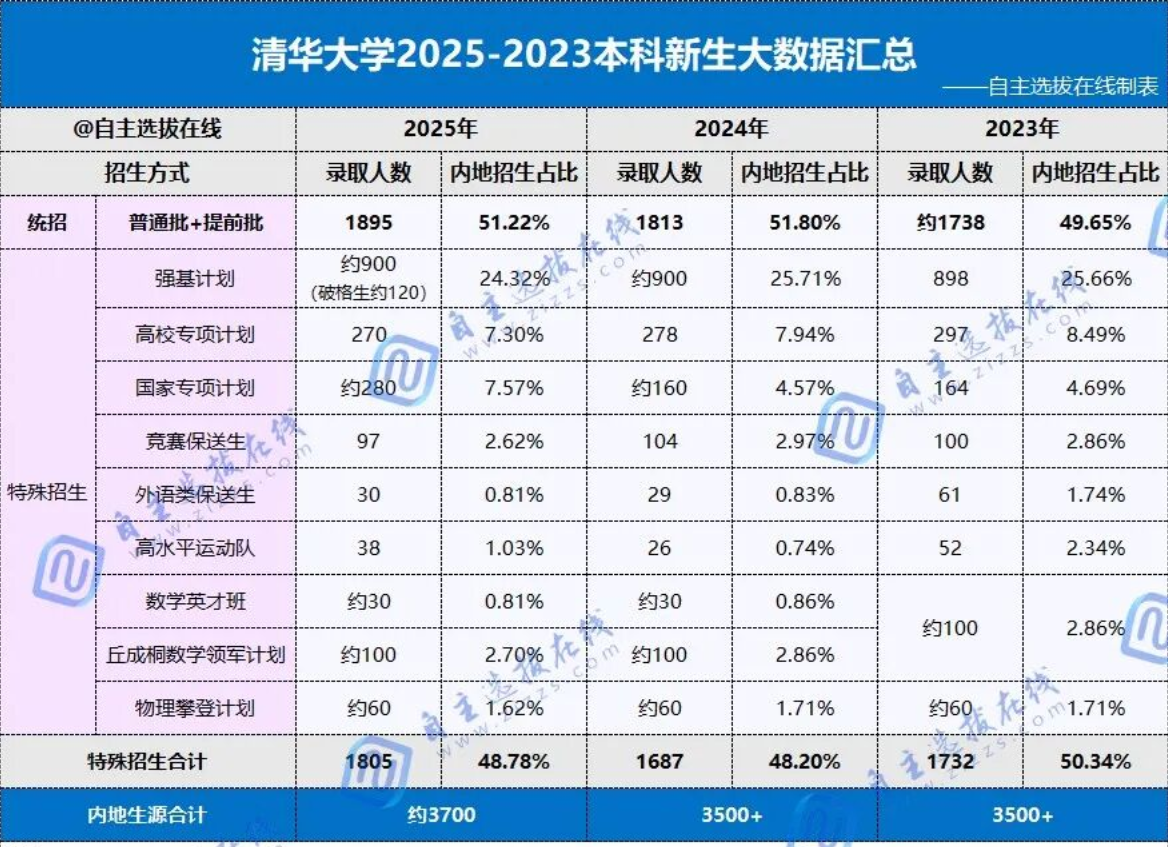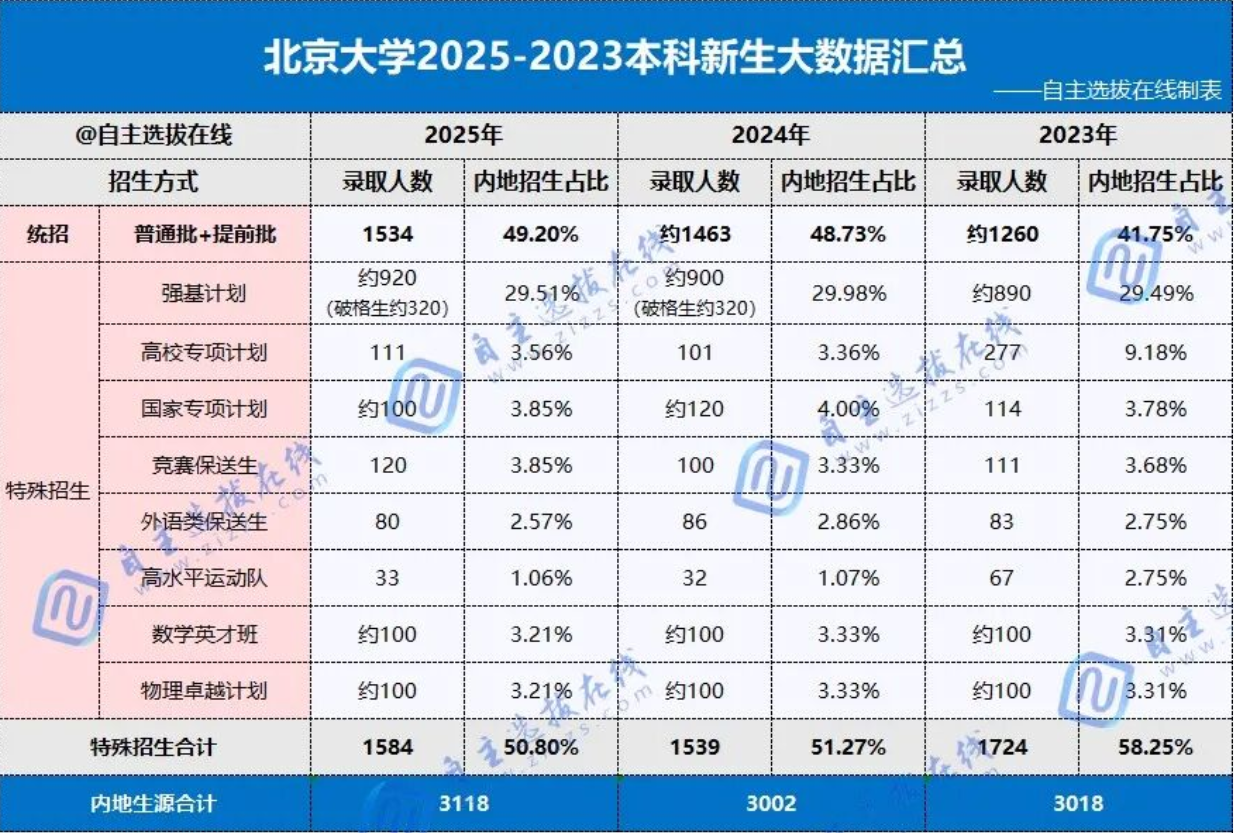 对比近三年数据,清华特殊招生人数在2025年有明显增加,突破1800人大关;北大2023年特招人数和占比非常高,录取1758人占新生的52.25%,近两年稳定在1500人左右,占比约50%。