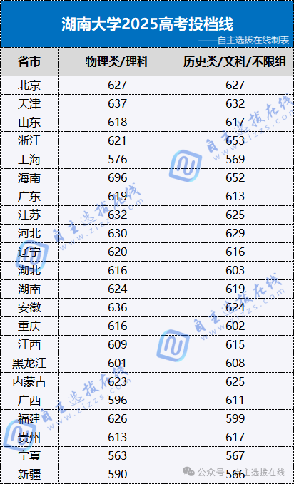 自主选拔在线为大家汇总整理了湖南大学2025各省市高考录取最低分数线数据,供各位考生家长参考。