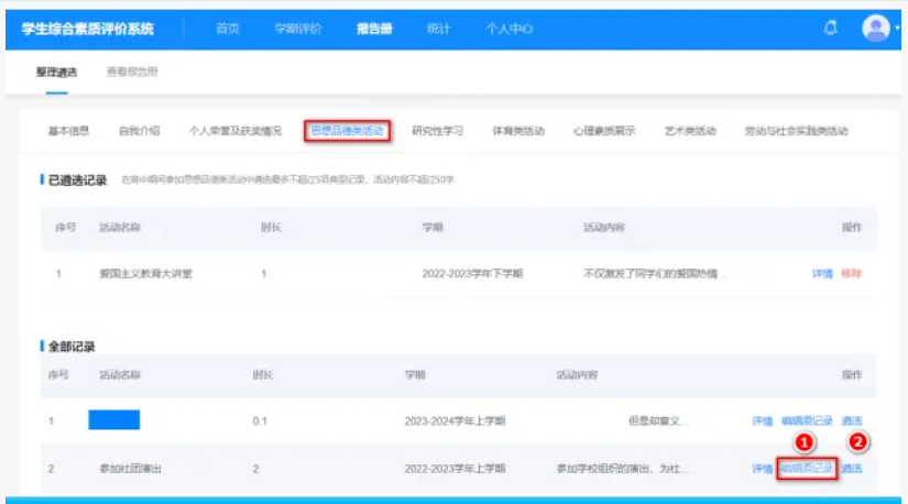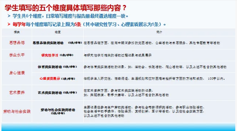 2、思想品德活动最多遴选5条、研究性学习最多遴选1条、体育类活动最多遴选5条、心理素质展示最多遴选1条、艺术类类活动最多遴选5条、劳动与社会实践类活动最多遴选5条展示在报告册中,可以修改原来的。
