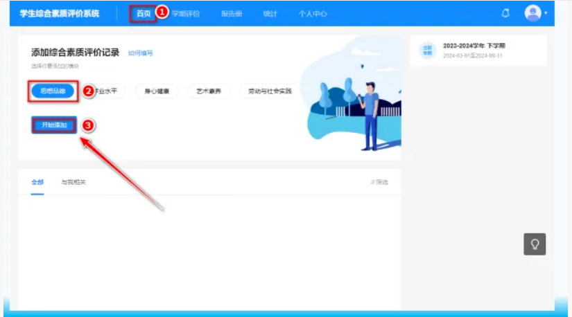 7、点击首页,添加综合素质评价记录-思想品德-开始添加。