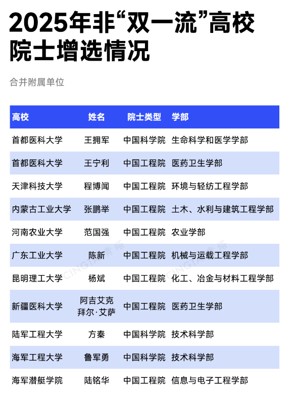 今年尤为特殊的是,院士增选与国家奖评审同步推进。此前,2025年国家奖初评结果已揭晓,21所非“双一流”高校表现亮眼,共有26项成果入选,其中首都医科大学、昆明理工大学、河南农业大学这3所成功增选院士的高校,同时通过国家奖初评。