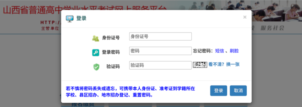 (二)若考生不慎将登录密码丢失或遗忘,可通过手机短信重置密码,在登录界面点击“忘记密码”,进入重置密码界面,输入身份证号,点击“获取验证码”,系统会将验证码发送到预留的手机号上,输入验证码、新密码进行密码重置;或用手机扫二维码进入人脸识别页面,识别通过后进行密码重置;也可持考生本人身份证或准考证到所属县(市、区)招生考试机构申请密码重置。