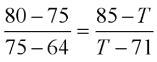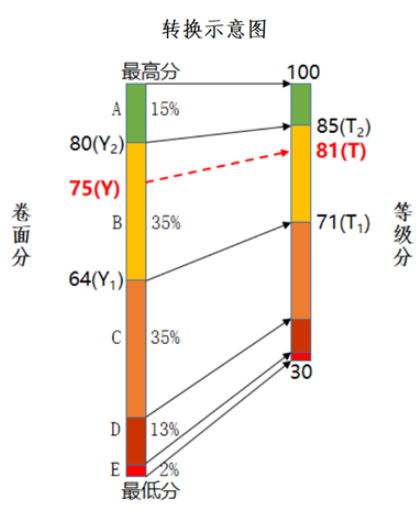 例如,假设某同学化学学科卷面分为75分,按照卷面分排序,等级比例应划分到B等级,而该学科B等级的卷面分分布区间为80~64,等级分区间为85~71,按照转换公式: