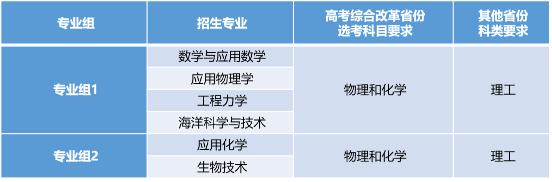 同济大学强基计划面向全国所有省份招收数学与应用数学、应用物理学、工程力学、海洋科学与技术、应用化学、生物技术共计6个专业,以下是选考科目、科类要求: