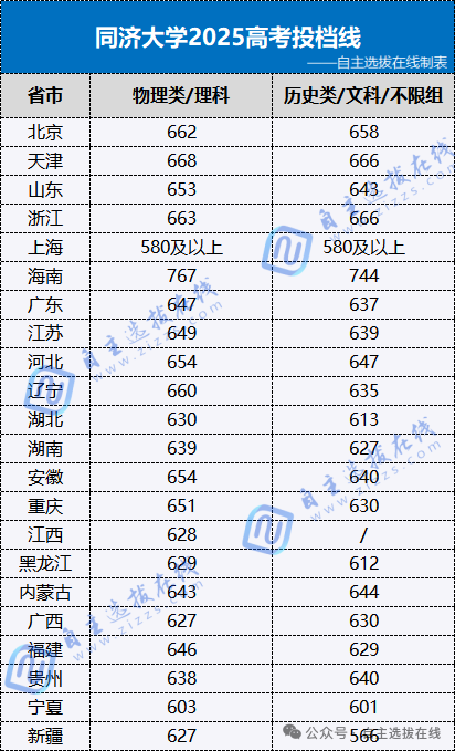 因为同济大学为高考出分前校测模式,所以没有强基入围分数线。自主选拔在线团队根据各省市教育考试院发布数据收集整理了同济大学2025年各省市高考最低录取分数线,供各位考生家长参考。