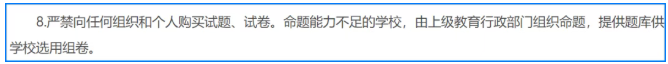 第8条明确提出,“命题能力不足的学校,由上级教育行政部门组织命题,提供题库供学校选用组卷。”