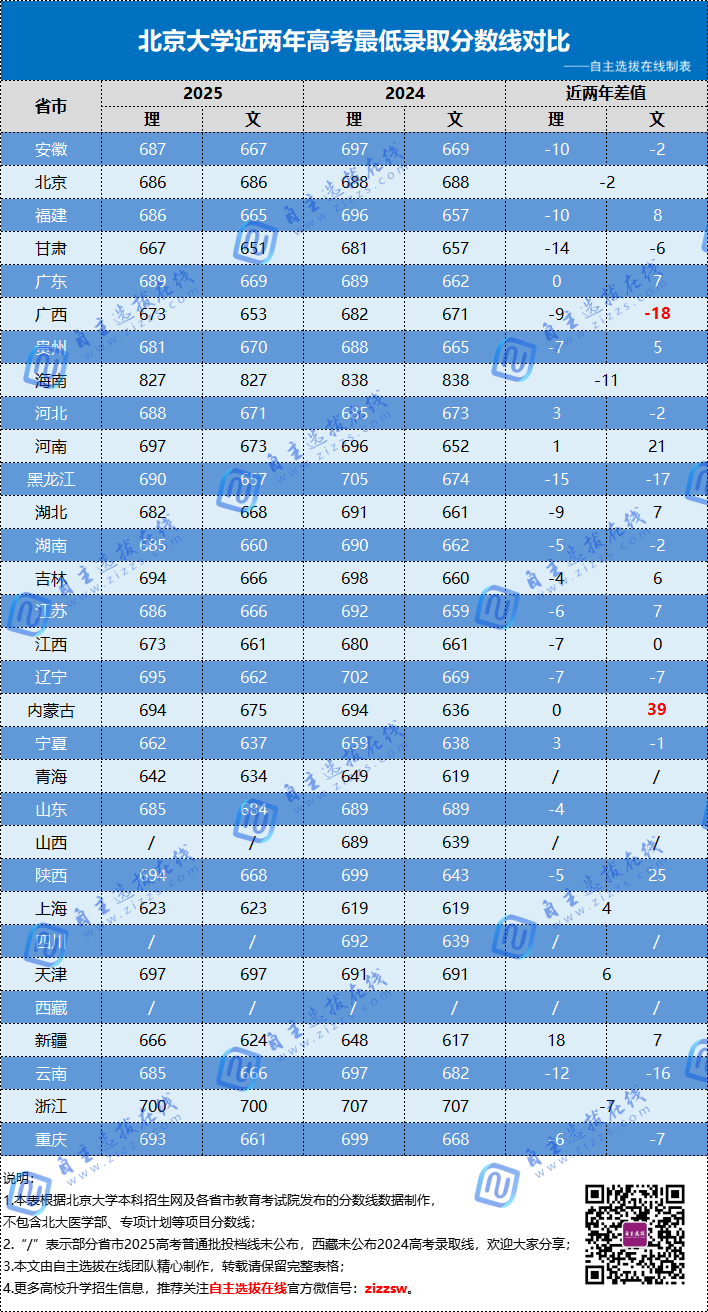 北京大学2025-2024年各省录取分数线对比: