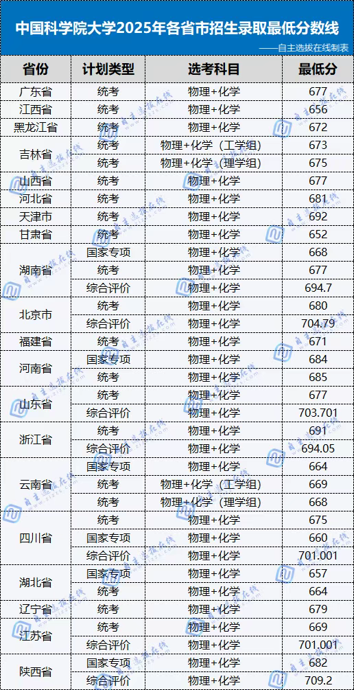 注:此分数线为高校官方公布;综合评价、国家专项为特殊招生项目,其中综合评价最低分为高考+校测综合成绩,非高考裸分;未出现省份为国科大暂未开放该省份招生。