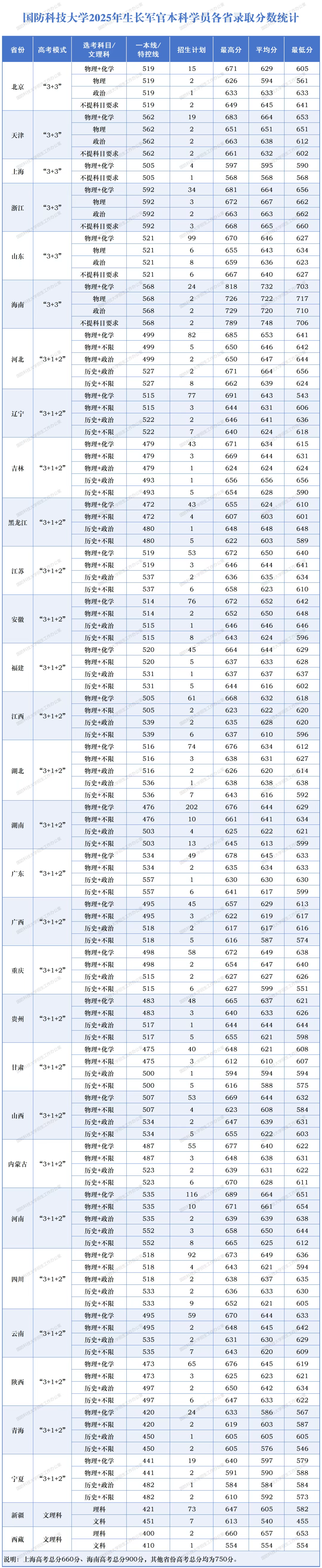 国防科大2025年各省录取分数线: