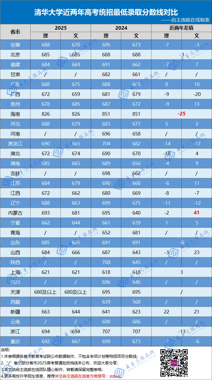 清华大学2025-2024年各省录取分数线对比: