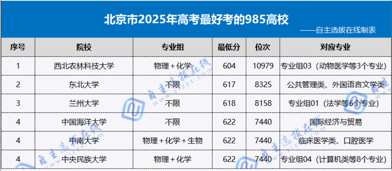 北京市考生最好考的几所985高校分别为西北农林科技大学、东北大学、兰州大学、中国海洋大学、中南大学、中央民族大学。观察2025年各高校在北京的录取情况,位次11000左右的考生都有机会考上985高校!