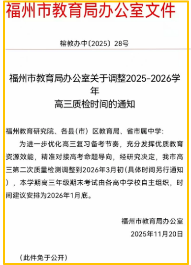2026福州高三二检时间将调整为2026年3月初开考,此外,福州期末高三的质检改为各校各自命题,大家提前做好考试准备!