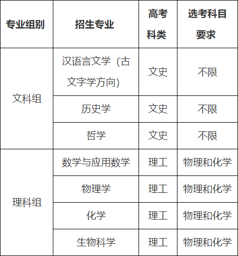 北师大强基计划共7个招生专业,分为文科组和理科组招生,理科组专业选科要求物理和化学(传统高考为理工),文科组专业选科不限(传统高考为文史)。