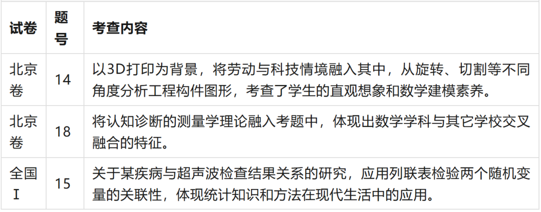 如2023年全国甲卷文理科第19题研究臭氧环境对小白鼠生长的影响,通过成对数据制成列联表进行独立性检验;新课标Ⅰ卷第10题利用对数函数研究噪声声压水平,考查对数及其运算的基础知识。