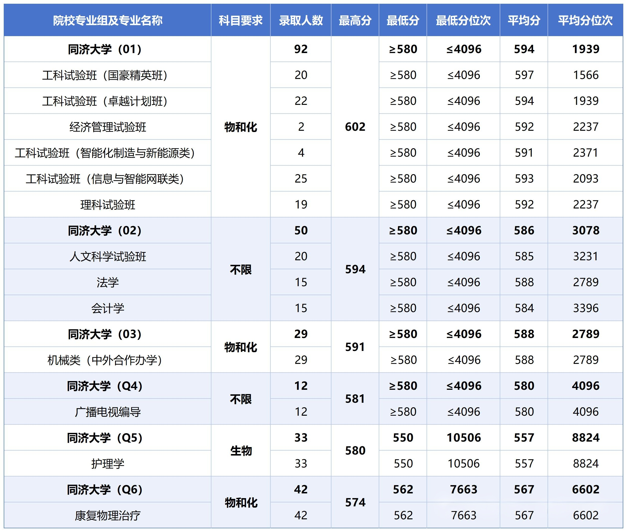 2025年同济大学综评批、普通批在沪分专业录取分数线汇总