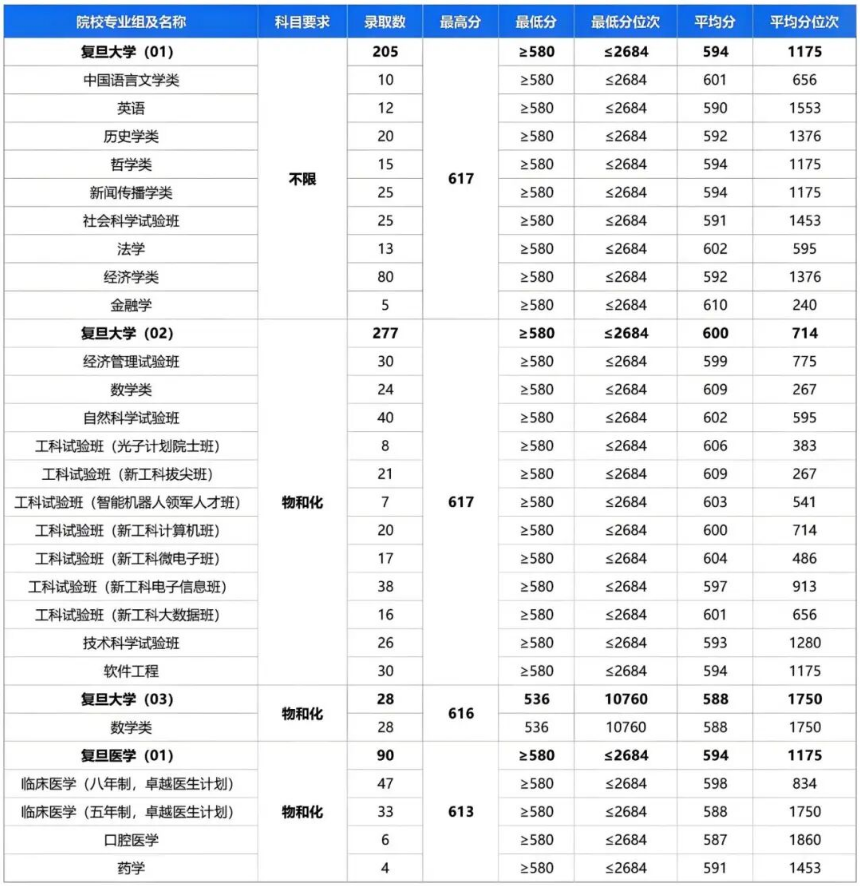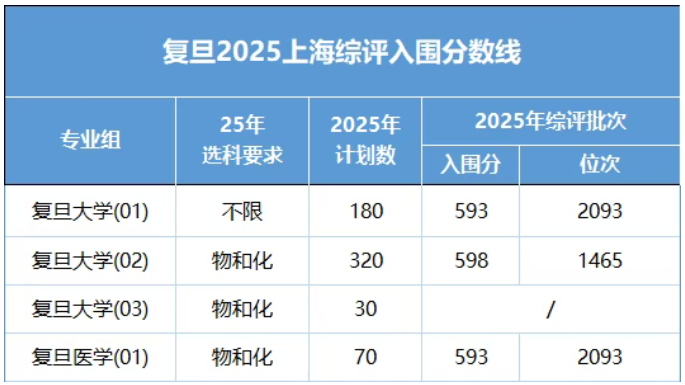 复旦2025年上海入围分在593分以上,各专业组入围分及位次如下: